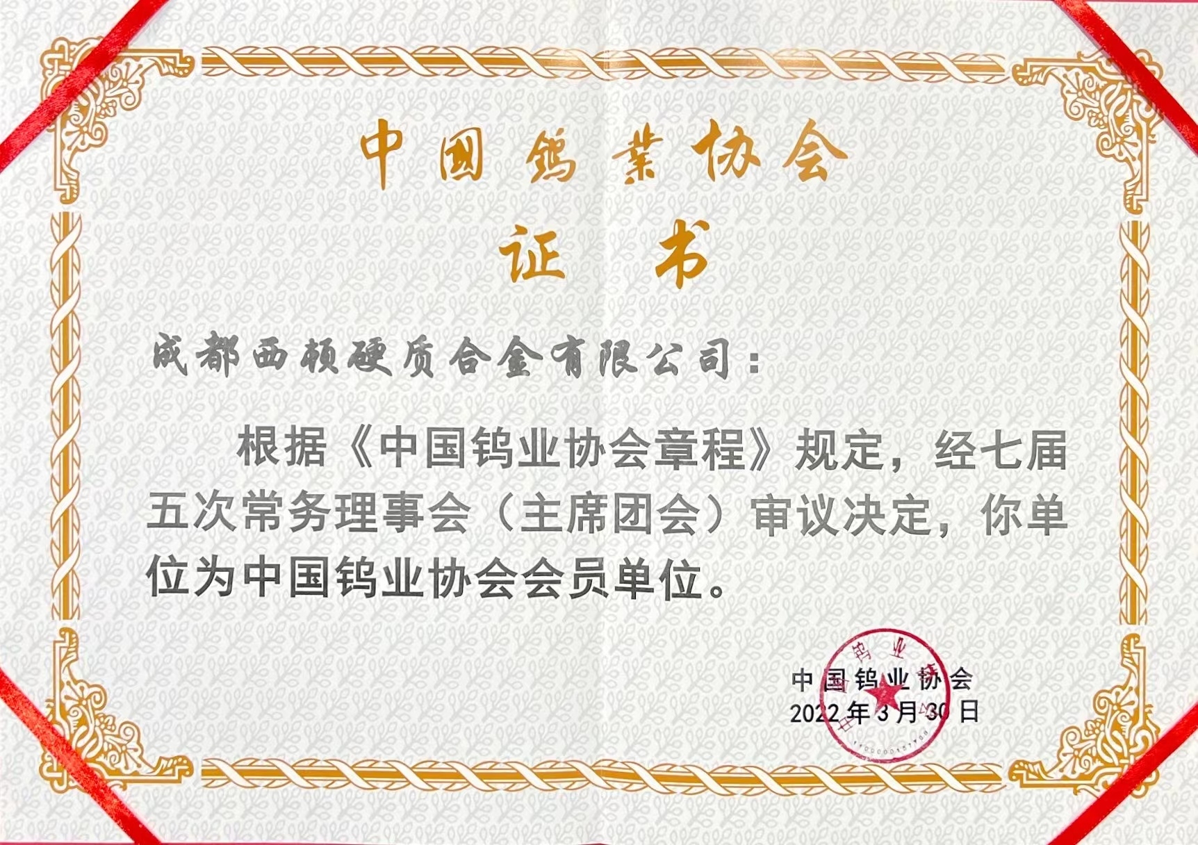 2022年3月30日,經(jīng)中國鎢業(yè)協(xié)會(huì )審議決定,成都西頓硬質(zhì)合金有限公司正式加入中國鎢業(yè)協(xié)會(huì ),成為中國鎢業(yè)協(xié)會(huì )會(huì )員單位。